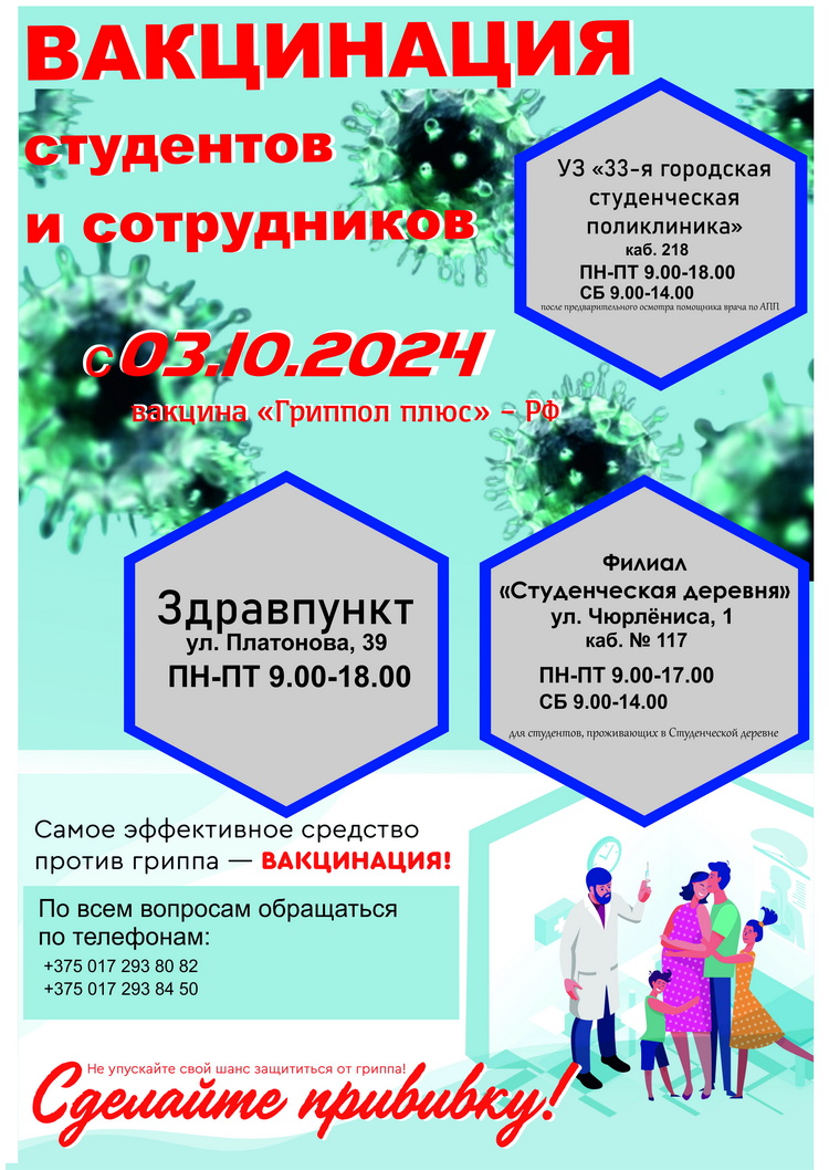На бесплатной основе предлагается вакцина Гриппол, производство РФ, на базе здравпункта БГУИР (ул. Платонова, 39-905).
